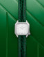 Nos bracelets en cuir aux subtils détails verts sont équipés d'une boucle ardillon qui a été dessinée avec attention pour répondre aux formes du boitier de votre Lady MANSART. Les angles et biseaux sont présents et le poli-brossé respecté.