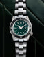 The FOREST model is assembled with a green sandy dial, steel indexes printed with tonal markings and railroad in light gray.