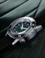 The steel window positioned at 3 o'clock displays numbers in retro typography in white on a black background and in green on the 3rd of each month.