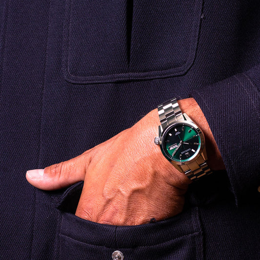 The steel aperture at 3 o'clock reveals retro-style numerals in white on a black background, and in green for each 3rd of the month.