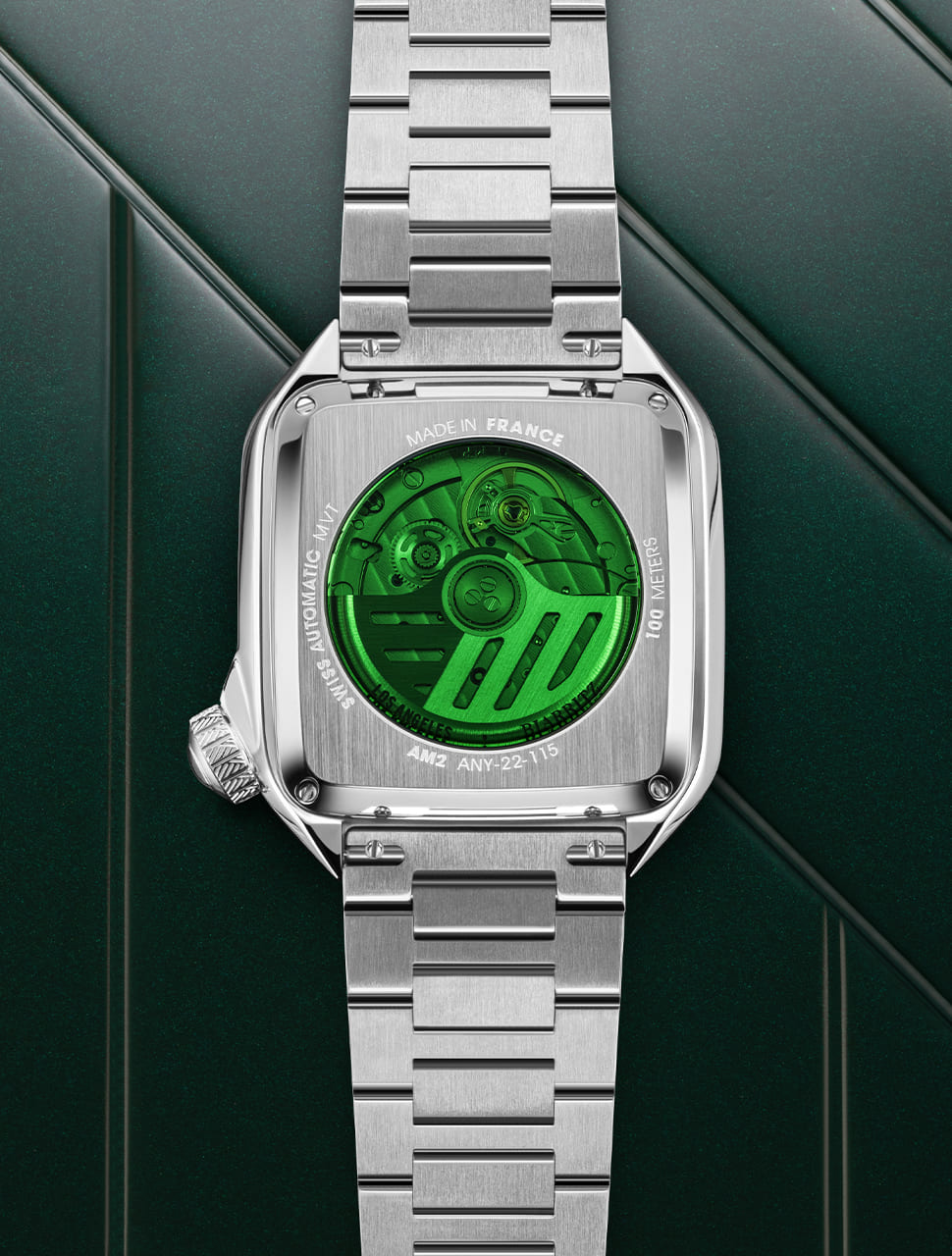 Au dos, le fond squelette signature vert plus clair magnifie la beauté du G110 dont la masse oscillante a été soigneusement perforée et brossée par des artisans français de renom.