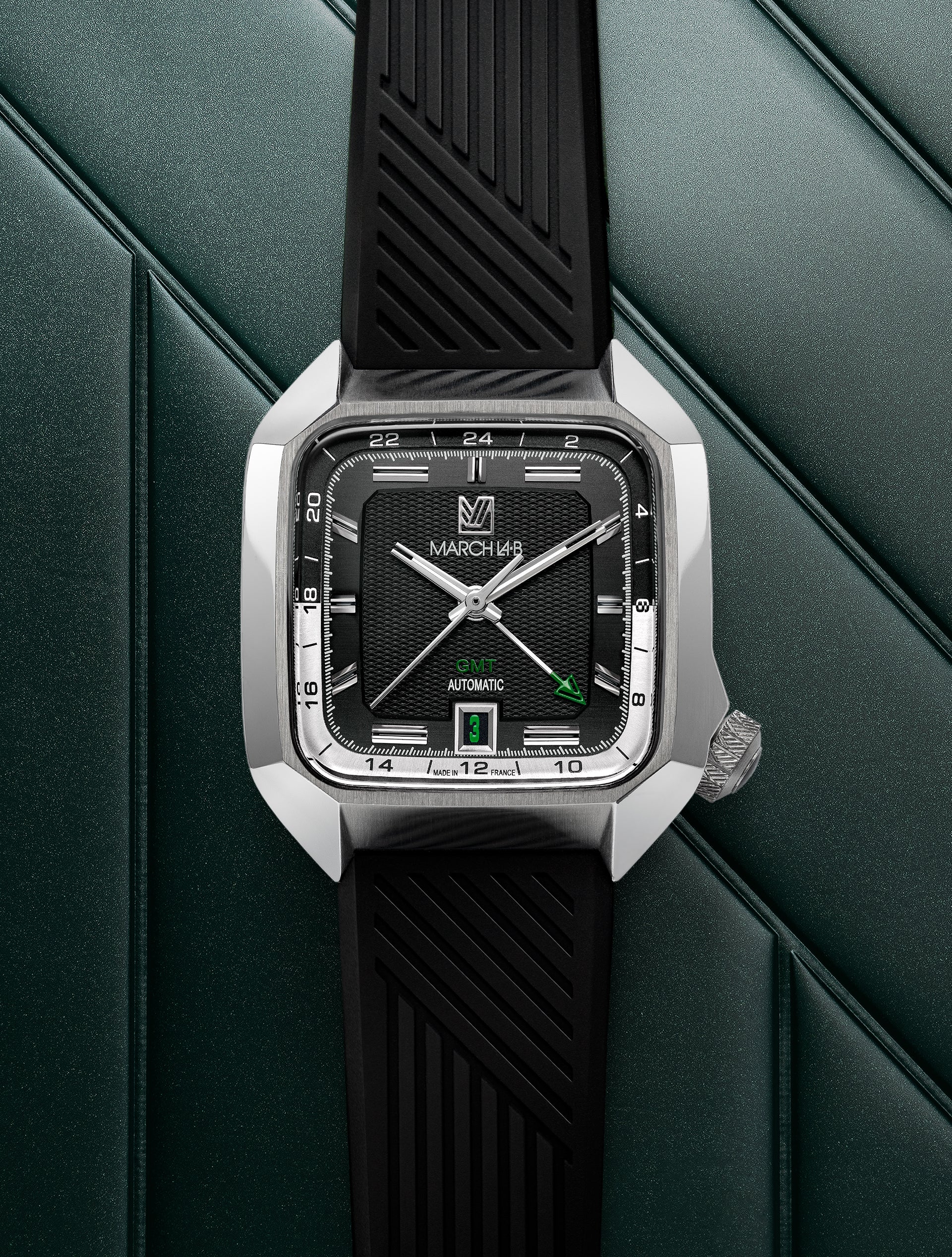 Son nouveau cadran texturé reprenant les index à bâtons signatures de la famille AM2 est encerclé des différents fuseaux 24 Heures. L’aiguille GMT verte et perforée complète les désormais classiques aiguilles diapasons identifiées March LA.B.