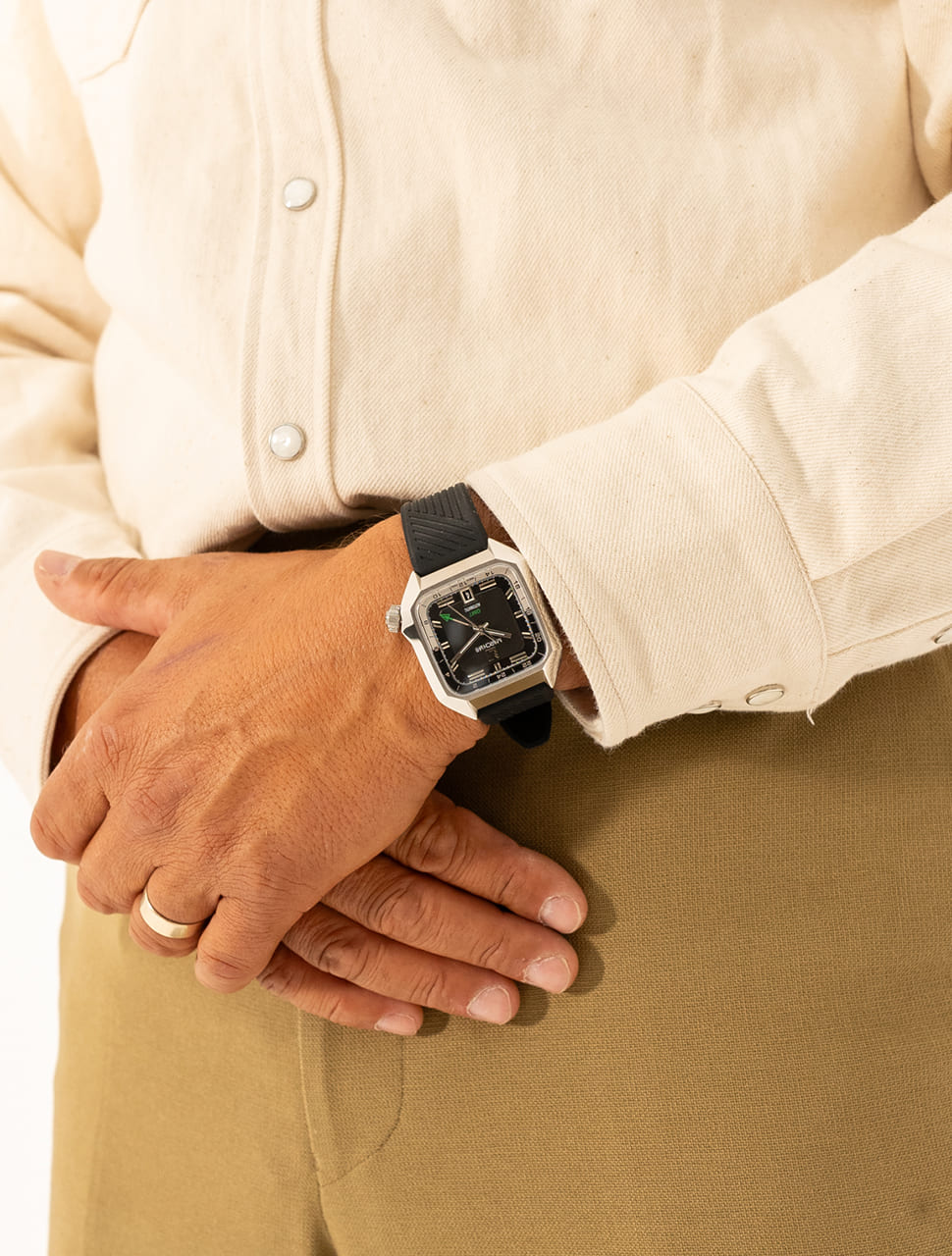 Le verre saphir de type « glass box » a été rabaissé pour affiner l’ensemble du garde-temps poli- brossé que nous avons assemblé sur un nouveau bracelet 3 maillons parfaitement intégré avec le boitier.