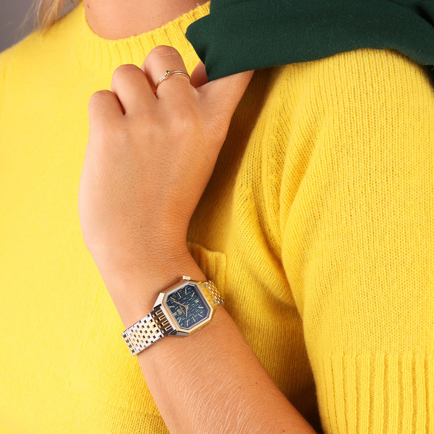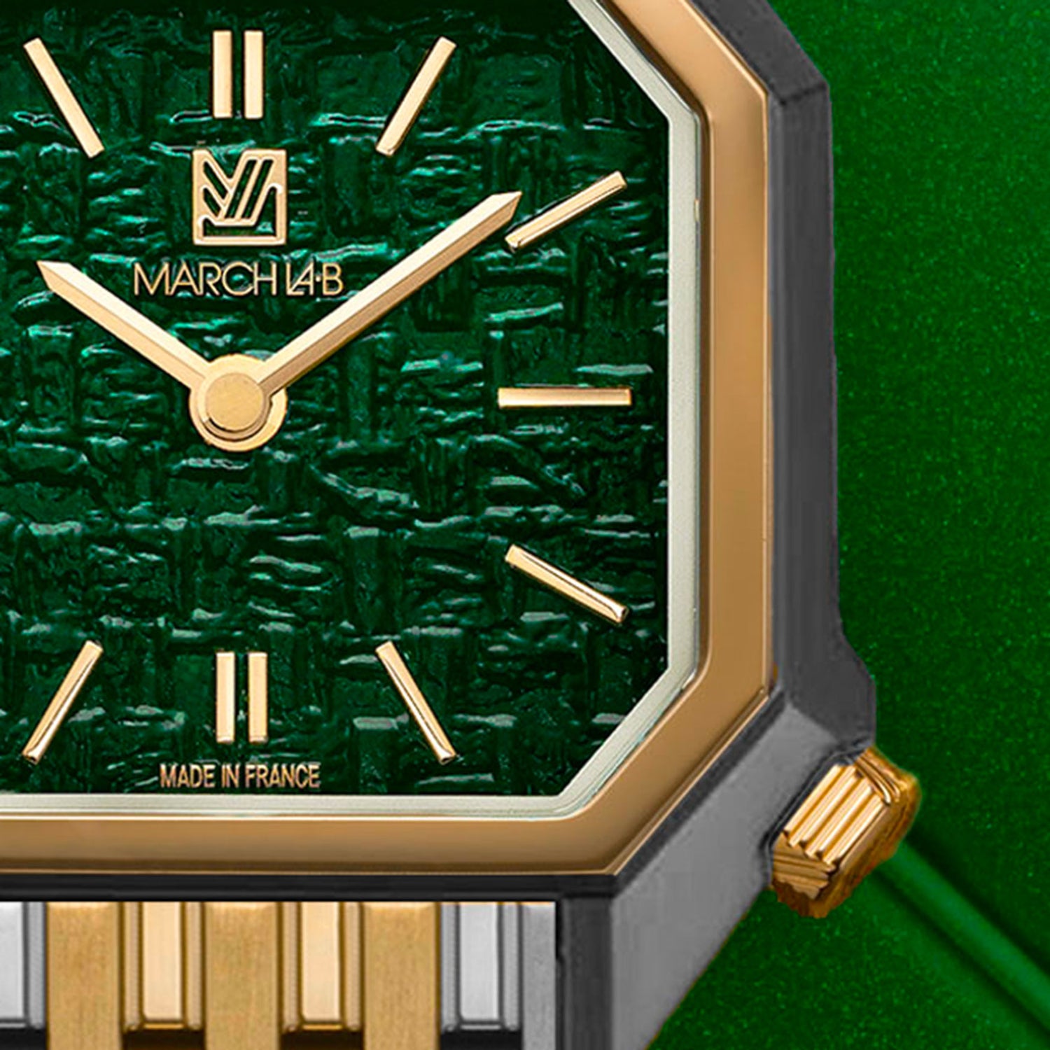 Dans sa version « Tweed Emerald », la Lady MANSART s’habille d’un cadran guilloché “tweed”, clin d’œil à ce tissu iconique du vestiaire féminin. Un jeu de texture subtil, entre lumière et relief, pour une élégance tissée à même le métal.