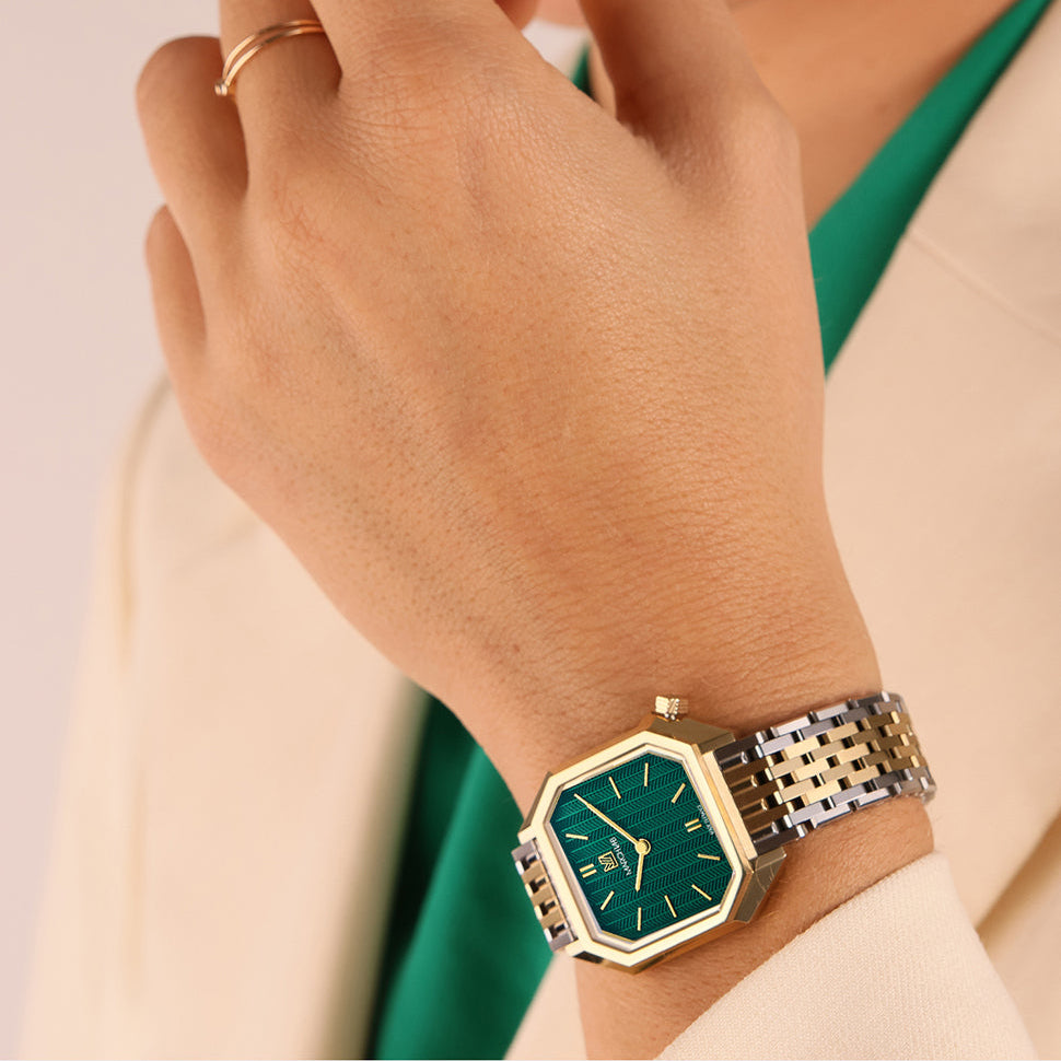 Dans sa version « Chevrons Emerald », son cadran à chevrons texturé capte les subtiles variations de lumières et sublime cette montre bijou française et fière de l’être.
