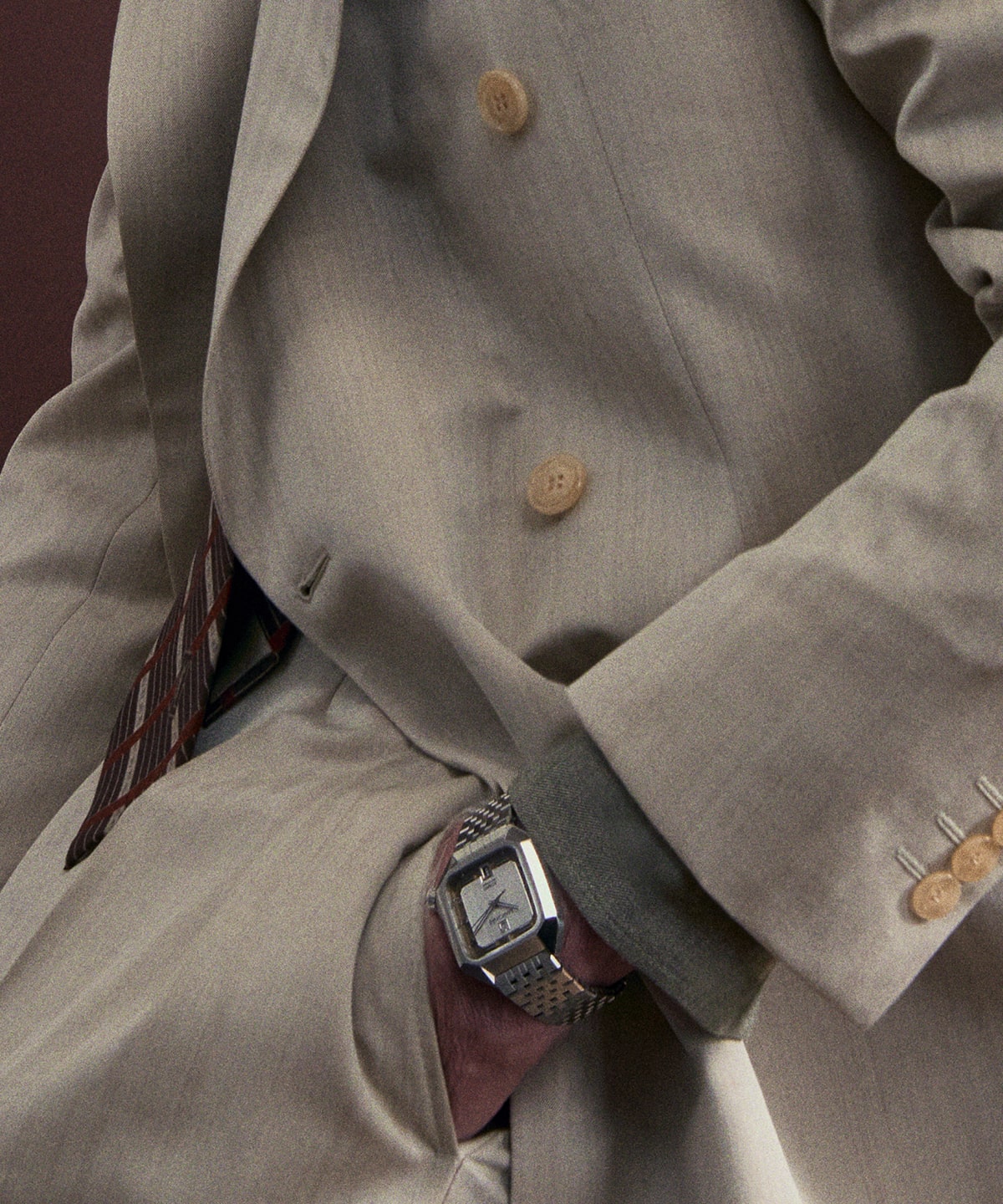Un discret chemin de fer imprimé encadre l’ensemble. Le guichet en acier positionné à 6H laisse apparaitre des chiffres à la typo rétro en blanc sur fond noir et en vert chaque 3 du mois.